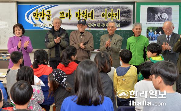 지난 3월 '꼬마탐험대' 생존자들이 모교인 김녕초에서 만장굴 탐험 이야기를 풀어내고 있다