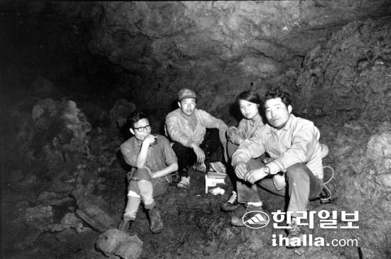 동굴 탐사 중 일행들과 휴식을 취하고 있는 부종휴 선생(맨 왼쪽) 사진=한라일보 DB