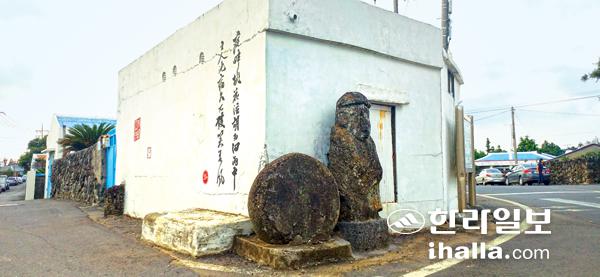 추사선생의 글씨체 옆으로 생존의 도구였던 방앗돌이 돌하르방과 함께 놓여있다.
