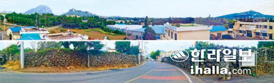 산방산에서 모슬봉까지 시야에 들어오는 마을회관 옥상 너머의 전경(위)과 대정성 서문이 있던 자리(아래).