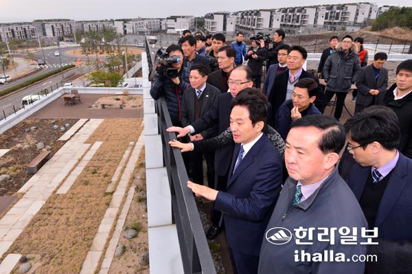 헬스케어타운 공사 현장을 찾은 원희룡 제주지사.