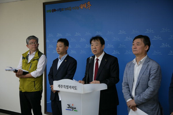 10일 김방훈 제주도 정무부지사, 강만생 워킹그룹 위원장, 강경식 제주도의회 의원, 김양보 제주도 환경보전국장 등이 참석해 한라산과 성산일출봉에 대한 탐방예약제 시행 내용을 설명하고 있다. 사진=제주도 제공