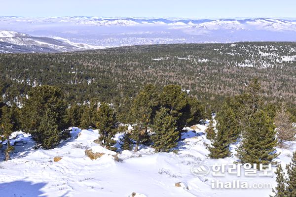 보그드한산 정상에서 멀리 울란바토르가 보인다. 이 산은 마치 광활한 초원 바다에 떠 있는 울창한 섬과 같다.