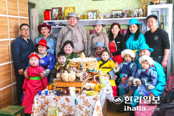 살란게렐과 쳇세그마 부부의 가족들이 설을 맞이해 자녀들과 손자 외손자 등 모두 17명이 모여 있다. 본 탐사대원 중 엥헤(가장 오른쪽) 가족이다.
