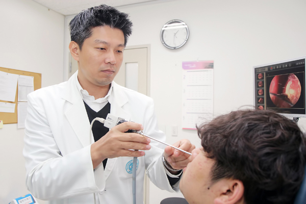 비염은 수개월 전부터 반복적으로 콧물, 재채기 등 관련증상이 반복적으로 나타나는 만성비염을 일컫는다. 제주대학교병원 이비인후과 강주완 교수가 비염환자를 치료하고 있다. 사진=제주대학교병원 제공