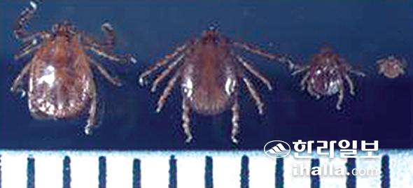 왼쪽부터 작은소피참진드기 암컷, 수컷, 약충, 유충(눈금한칸: 1mm).