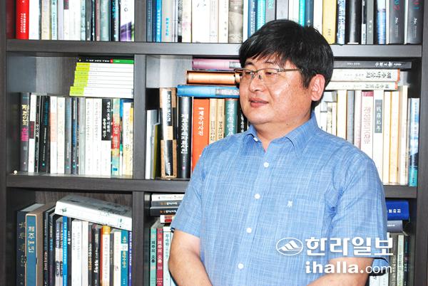 출판사 한쪽에 놓인 서가엔 제주를 다룬 책들이 빼곡했다. 헌 책방에서 수십만원을 주고 산 비매품 도서도 있었다. 그는 제주를 알아야 제주에서 더 좋은 책을 빚는다는 생각에 제주 관련 자료가 나올 때마다 구입해왔다.