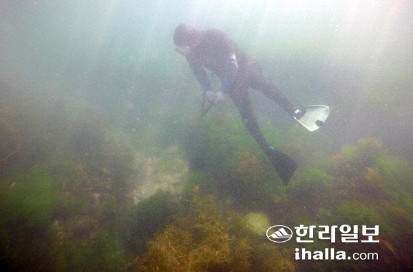 지난 15일 부산광역시 영도구 동삼동 바닷속에서 남항동어촌계 이금숙 해녀회장이 해산물을 채취하고 물밖으로 상승하고 있다. 사진=부산광역시 영도구에서 강경민기자