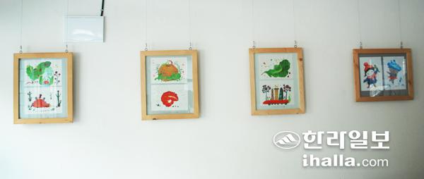 딜다책방 한쪽 벽에 '까미의 눈모자' 원화전이 열리고 있다.
