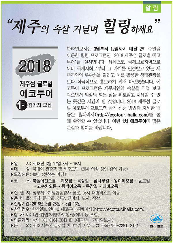 [알림] 2018제주섬 글로벌 에코투어 1차 참가자 모집