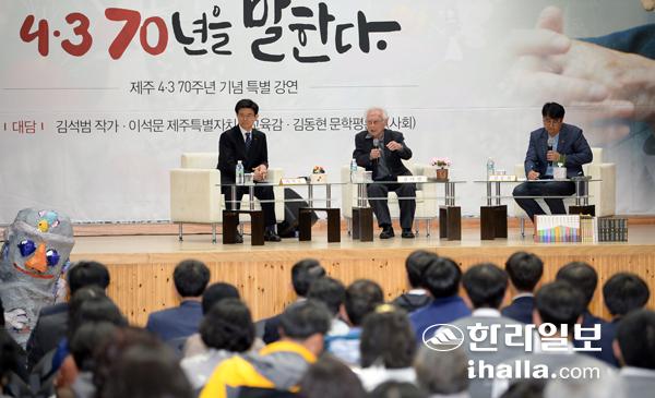 김석범 작가(가운데)가 지난달 제주북초등학교에서 '4·3 70년을 말하다'란 이름으로 대담을 펼치고 있다./사진=한라일보DB