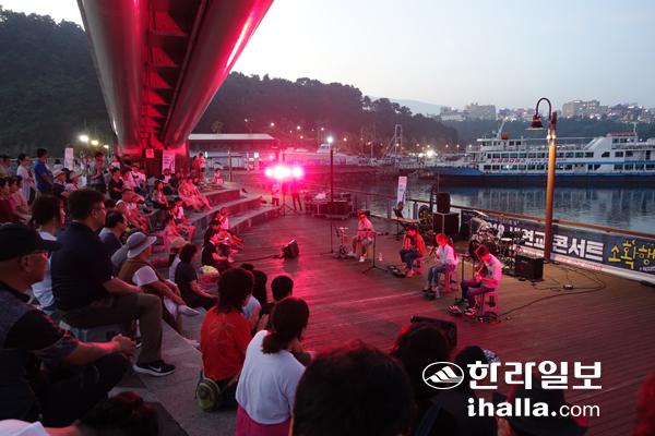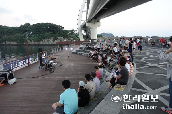 새연교에서는 지난 5월 22일부터 매주 토요일 오후 7~9시 소소한 재미를 느낄 수 있는 '2018 새연교 콘서트'가 열리고 있다. 무대가 펼쳐지는 곳이 도내 여러 곳이지만 세계적으로 이름난 미항에 견줘도 손색없다는, 어떤 이는 세계 3대 미항보다 더 아름답다는 서귀포 밤바다를 바로 옆에 끼고 열리는 무대라는 사실만으로도 충분히 매력적이다. 때마침 휴가철을 맞아 서귀포시를 방문했다 공연을 마주한 여행객들에게는 색다른 추억거리를 하나 더 얹어주는, 서귀포에 터잡고 사는 이들이라면 저녁 마실삼아 좋은 이들과 함께 즐길 수 있는 무대다.