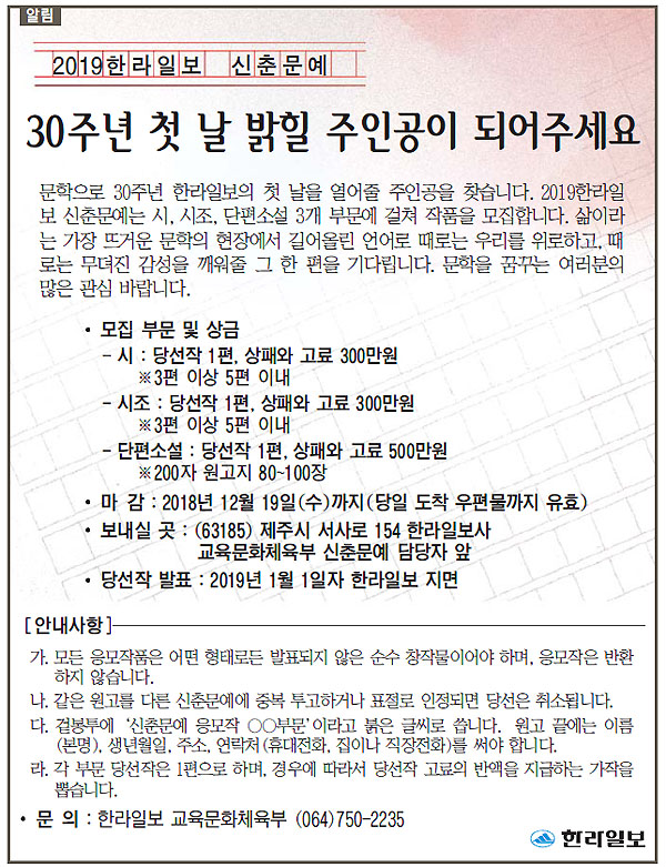 [알림]2019한라일보 신춘문예 "30주년 첫 날 밝힐 주인공이 되어주세요"