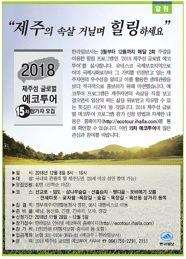 [알림]'2018 제주섬 글로벌 에코투어' 15차 참가자 모집
