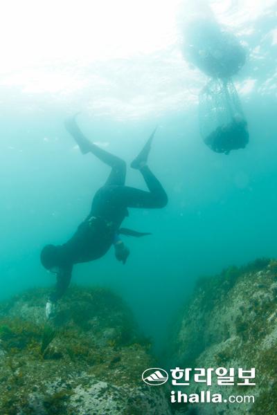 북한 황해도 장산곶이 한 눈에 들어오는 백령도에서 물질하는 제주출신 김호순(70)해녀는 이곳의 마지막 해녀이다. 이 분이 물질을 그만두면 이곳의 숨비소리는 기억으로 만 남을 것이란 생각에 눈시울이 불거졌다.