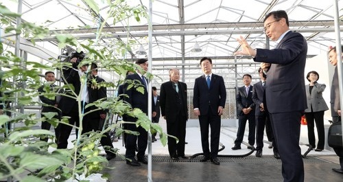리종혁 조선아시아태평양평화위원회 부위원장과 북한 대표단이 지난 15일 경기도 화성시 경기도농업기술원을 방문해 첨단온실을 둘러보고 있다.연합뉴스