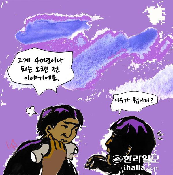 "그럼 괸당 문화라고 아시겠군요. 끼리끼리 다 연결되어 있어요. 재판을 걸었죠. 헌데 더 참담한 건 변호사를 구하기가 어려웠어요. 어떤 변호사는 도의 자문변호사라서, 어떤 변호사는 도의 담당국장과 인척간이라서, 도와 싸워서 이겨도 실속이 없다는 등 회피하는 변호사가 많았어요. 겨우 외지에서 온 변호사를 구하긴 했는데, 헌데 이번엔 법원에서 공판을 차일피일 미루는 거예요. 제주도를 상대로 하는 싸움에 모종의 압력이 있는 게 분명해요. 현장에 가보면 정말 개발 불가 지역인지 아닌지 단번에 알 수 있는데 말이죠."