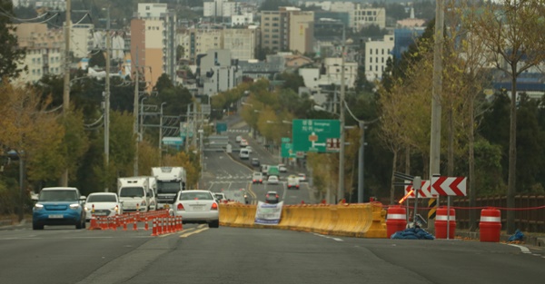 서홍동 중산간동로 일대서 이뤄지고 있는 대풍피해 복구 공사현장. 현장에는 안전확보의 일환으로 왕복 4차로가 왕복 2차로로 제한돼 통행이 이뤄지고 있다. 이태윤기자