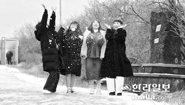 3일 한라산 1100도로에서 관광객들이 눈 쌓인 하얀 배경으로 기념사진을 찍고 있다. 이상국기자