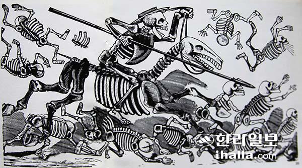 덧없는 죽음의 횡포를 풍자한 판화. 뽀사다 작, 미치광이 돈키호테, 멕시코, 1890년대.