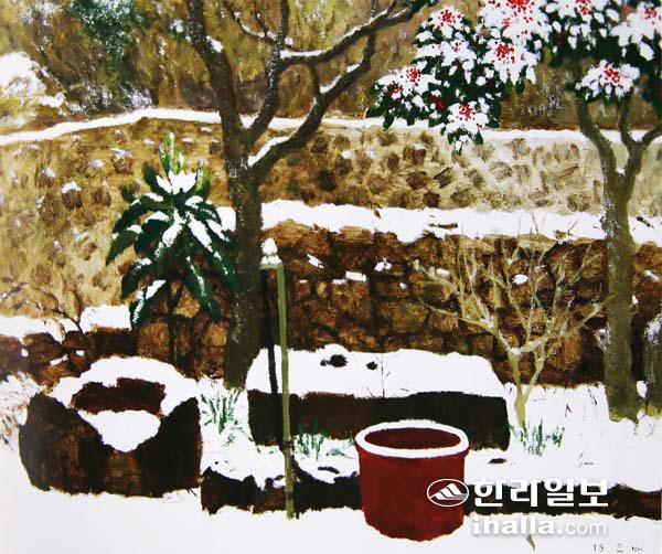 그렇다면 이번 전시의 의미를 돌아보자. 1947년 3·1절 대회 때 제주도민들이 "3상회의 결정 즉시실천, 미소공동위원회 재개, 3·1정신으로 통일독립 쟁취하자"라는 슬로건을 주장했던 사실을 생각하면 강요배의 'DMZ와 금강산'전의 상징성을 알 수 있다. 한라산과 백두산 중간이기도 한 금강산은, 봉래산(蓬萊山)이라는 이름으로 한라산[瀛洲山], 지리산[方丈山]과 더불어 중국 고대사의 유명한 삼신산이기도 하다. 그러니까 한반도 역사에서 이 삼신산 모두 마치 징검다리처럼 4·3, 여순항쟁을 지나 한국전쟁으로 이어지는 비극적 사건의 장소로 오늘의 분단상황과 직결되고 있다. 이 'DMZ와 금강산'은 "과거 '4·3'과 미래 '통일'"이라는 사건의 만남이 중첩되는 공간으로써, 앞으로 한반도 평화의 실현이 이루어져야할 곳, 그래서 하루바삐 종전이 선언되고 외세 개입의 무풍지대가 돼야 할 곳이다.