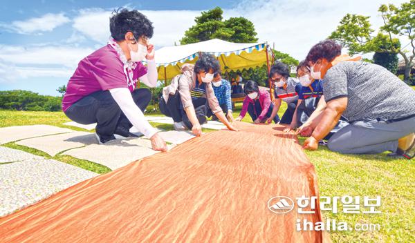 지난 25일 서귀포시 표선면 제주민속촌을 찾은 관광객들이 감물들이기 전통염색체험을 하고 있다. 이상국기자