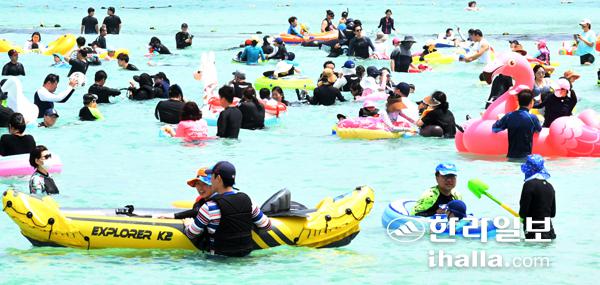 폭염이 기승을 부린 8월 첫 주말인 2일 제주시 협재해수욕장에는 피서객들이 몰려와 물놀이를 즐겼다. 이상국기자