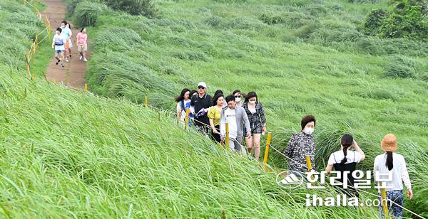 폭염이 기승을 부린 8일 관광객들이 애월읍 새별오름을 찾아 제주의 여름을 만끽하고 있다. 이상국기자