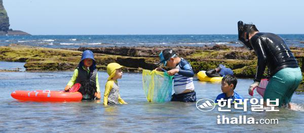 15일 서귀포시 성산읍 광치기해변을 찾은 관광객들이 스노클링을 하며 추억을 쌓고 있다. 이상국기자