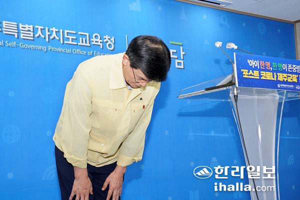 이석문 제주도교육감이 18일 도교육청 기자실에서 기자회견을 열고 지난 15일 열린 제75주년 광복절 경축식에서 발생한 사건에 대해 고개를 숙이고 있다. 사진=제주도교육청 제공