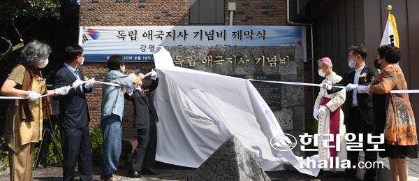 18일 제주시 신성여자고등학교 신성 100주년 역사관에서 제주의 여성 항일운동가 고(故) 강평국, 고수선, 최정숙 선생의 정신을 기리는 '독립 애국지사 기념비 제막식'이 거행됐다. 이상국기자