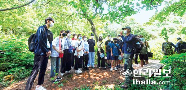 19일 서귀포시 화순곶자왈에서 국립평창청소년수련원에서 방문한 청소년들이 곶자왈사람들이 진행하는 숲체험 프로그램에 참여해 숲해설을 듣고 있다. 이상국기자