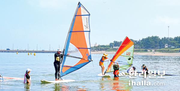 20일 제주시 이호테우해수욕장에서 관광객들이 윈드서핑을 배우며 즐거운 추억을 만들고 있다. 이상국기자