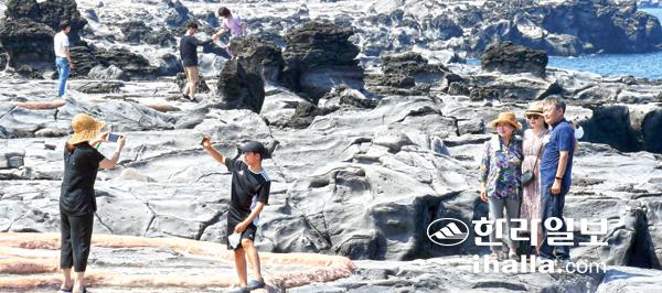 20일 제주시 구엄리 돌염전을 찾은 관광객들이 기념사진을 찍으며 즐거운 시간을 보내고 있다. 이상국기자