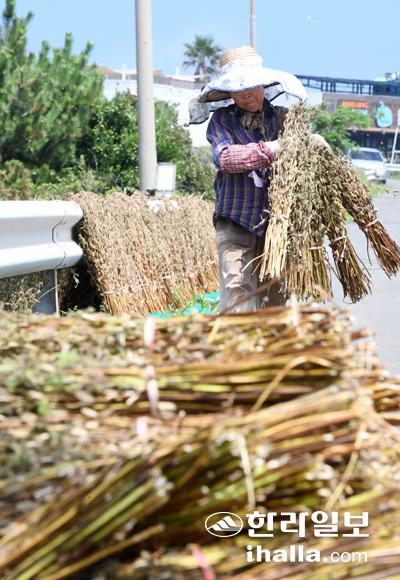 장마가 길어지고 일조량이 부족해 참깨수확량이 저조한 가운데 20일 제주시 애월읍 한 농민이 더위와 싸우며 참깨 털기작업을 하고있다. 이상국기자
