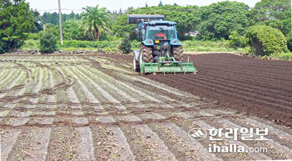 10일 태풍 피해를 입은 서귀포시 성산읍의 한 밭에서 발아한 무 싹들이 제대로 자라지 못하게 되자 농민이 밭을 갈아엎고 있다. 이상국기자