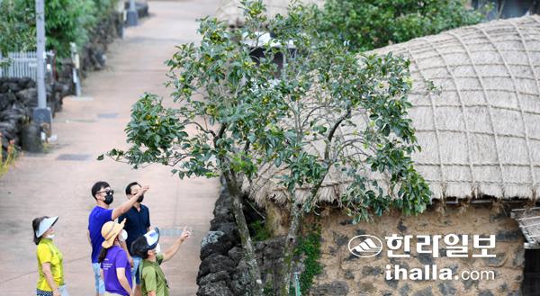 10일 서귀포시 표선면 성읍민속마을을 찾은 관광객들이 제주전통초가집과 감나무 등을 구경하며 제주의 초가을 정취를 즐기고 있다. 이상국기자