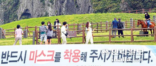 15일 서귀포시 성산읍 성산일출봉을 찾은 관광객들이 마스크를 쓴 채 주변을 둘러보고 있다. 이상국기자