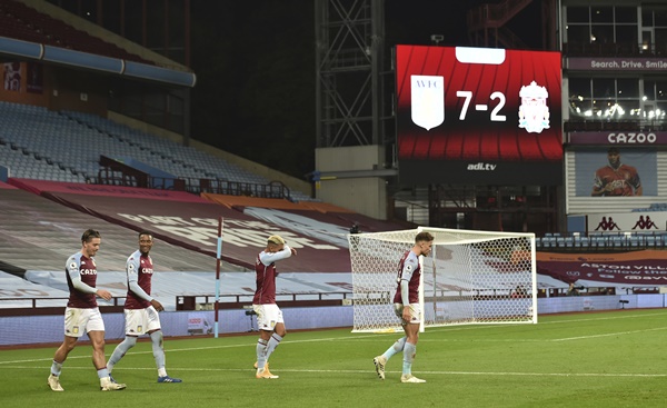 리버풀에 7-2로 대승한 애스턴 빌라 선수들. 연합뉴스