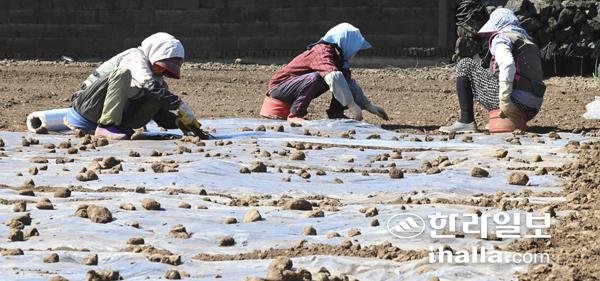 6일 제주시 애월읍의 한 밭에서 겨울에도 양파가 잘 자랄 수 있도록 비닐 씌우기 작업이 한창이다. 이상국기자