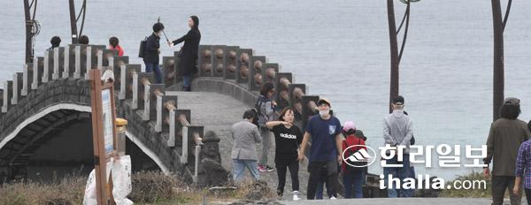 21일 제주시 함덕해안산책로를 찾은 관광객들이 바다를 구경하며 즐거운 시간을 보내고 있다. 이상국기자