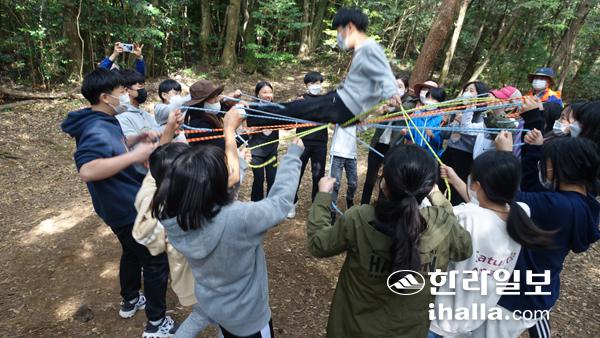 지난달 29일 서귀포시 남원읍 고살리 숲길에서 숲학교 프로그램에 참여한 귀덕초등학교 6학년 학생들이 '해님 밧줄놀이'를 하고 있다. 강다혜기자