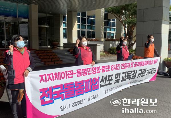 사진=전국학교비정규직노동조합 제주지부는 3일 제주도교육청 앞에서 기자회견을 열고 오는 6일 총파업에 나선다고 밝혔다. 송은범기자