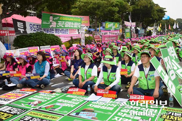제주학교비정규직연대회의가 지난해 7월 제주도교육청 앞 도로에서 개최한 총파업 결의대회.
