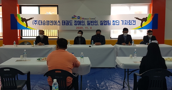 사진=(주)대승엠엔에스(대표이사 채윤석)는 4일 제주시 일도2동 대경빌딩에서 기자회견을 열고 "장애인과 비장애인 선수가 혼합된 태권도 실업팀을 다음달 창단한다"고 밝혔다. 송은범기자