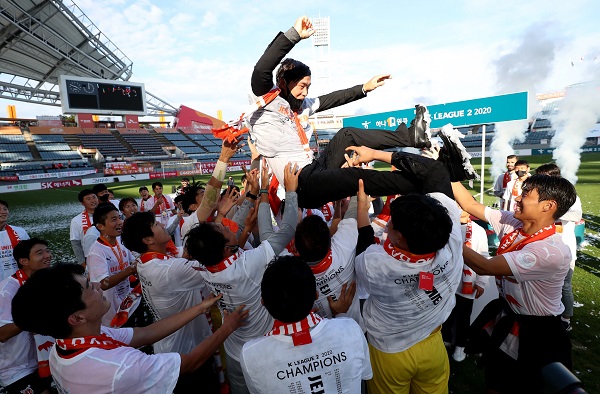 지난 1일 우승을 확정 짓고 제주 선수들이 남기일 감독에게 행가래를 하고 있다. 사진=제주유나이티드 제공