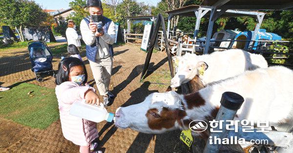 11일 제주시 월평동 아침미소목장을 찾은 관광객들이 젖소 먹이주기 체험을 하고 있다. 이상국기자
