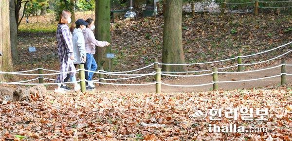 18일 제주시 한라수목원을 찾은 시민들이 떨어진 낙엽들 사이로 산책을 하고 있다. 이상국기자