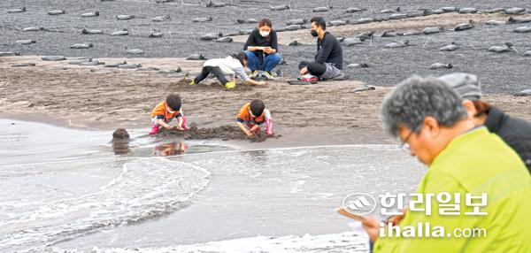 18일 제주시 삼양동 삼양해수욕장에서 어린이들이 모래놀이를 하며 즐거운 시간을 보내고 있다. 이상국기자
