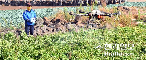 지난 21일 서귀포시 대정읍 한 감자밭에서 농민이 드론을 이용해 농약을 살포하고 있다. 이상국기자